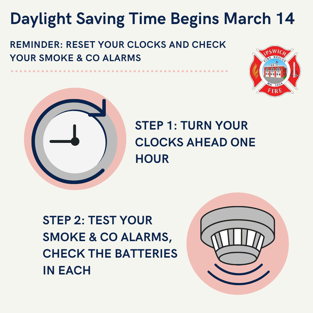 IPSWICH —Chief Andy Theriault and the Ipswich Fire Department wish to remind residents to test their smoke and carbon monoxide alarms and check the batteries in each when they move their clocks ahead to start daylight saving time Sunday.